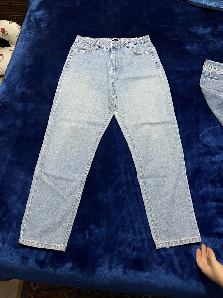 Pastel mavi renkte, bol kesim ve midi boy kot pantolon. Günlük kullanım için rahat, sokak modasına uygun şık bir parça.