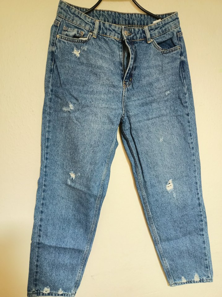 Bol kesim, mavi denim kadın jean, tokalı detaylı, günlük kullanıma uygun normal boyda, sokak stilinde rahat bir model.