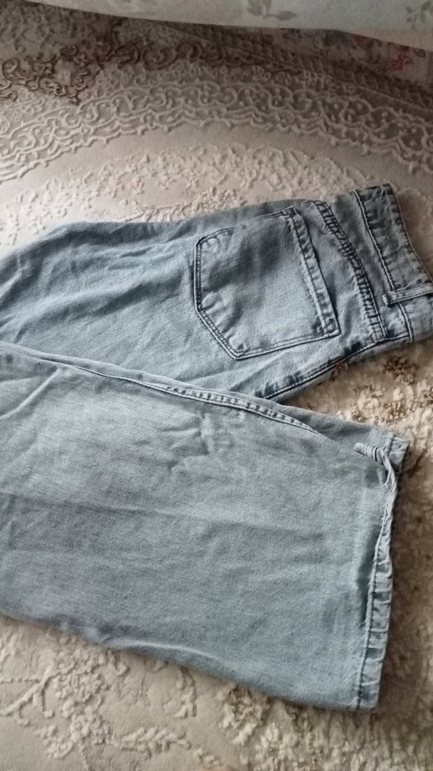 mavi renkte, bol kesim ve midi boyda denim kadın pantolon. Günlük kullanım için rahat ve şık, trend bir casual stil sunar. birkac kez giyildi ufak bi leke var