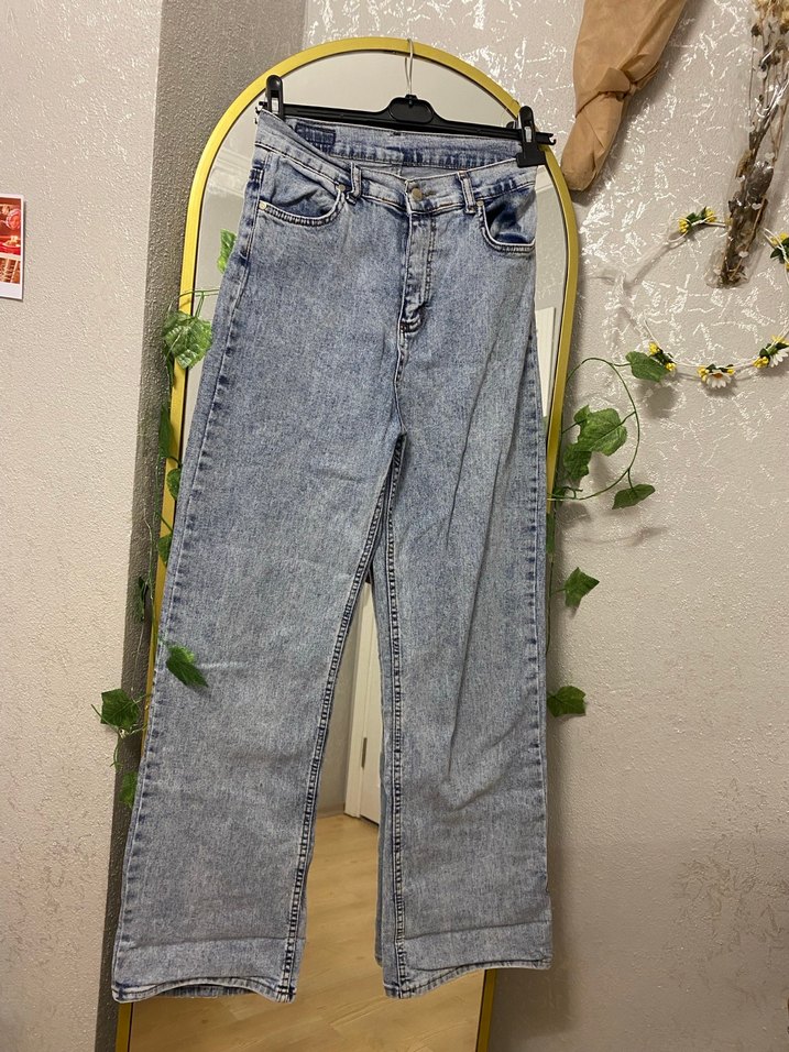 Açık mavi kot pantolon, bol kesim ve kemer detayıyla. Midi boy ve batik desenli, günlük kullanıma uygun rahat bir tarz sunar.