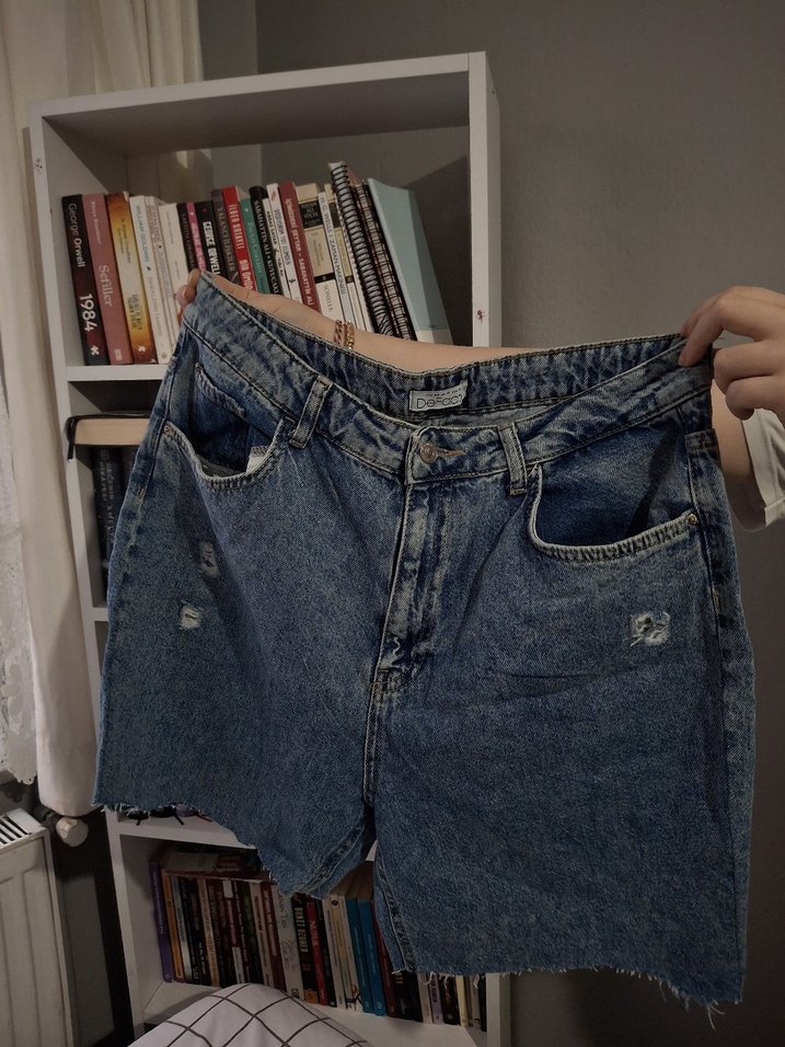 Mavi kot şort, bol kesim ve kemerli detaylıdır. Kısa boyu ve hafif yıpranmış görünümüyle rahat sokak stiline uygundur.