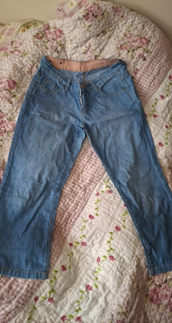 Mavi renkli, bol kesim, midi boy denim pantolon. Kemer tokalı ve günlük kullanıma uygun bohem tarzda.