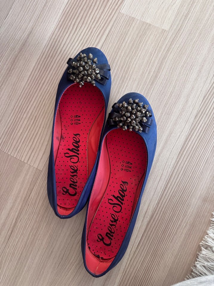 Mavi kadın babet, ön kısmında boncuk detayları ve renkli baskılı.