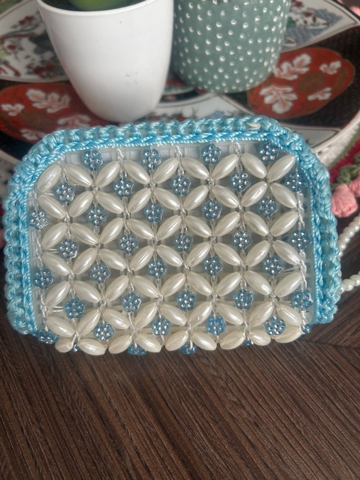 Mavi renkte boncuk işi ile yapılmış, el emeği boncuk işlemeli ve nakış desenli bohem tarzda kadın cüzdan , Pastel tonları ve detaylı boncuk işçiliğiyle günlük kullanıma uygundur.