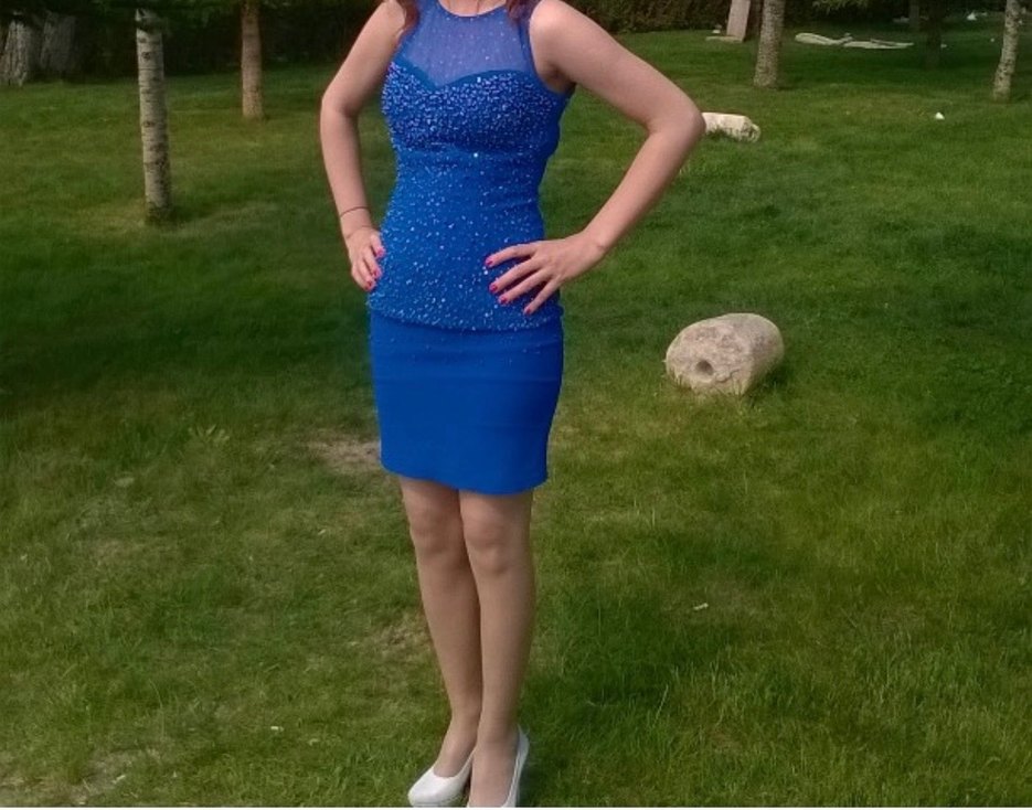 Mavi, boncuk işlemeli, straplez, vücuda oturan kısa elbise. Transparan yakası ve kolsuz tasarımıyla dikkat çeker. Parti için uygundur. ✨