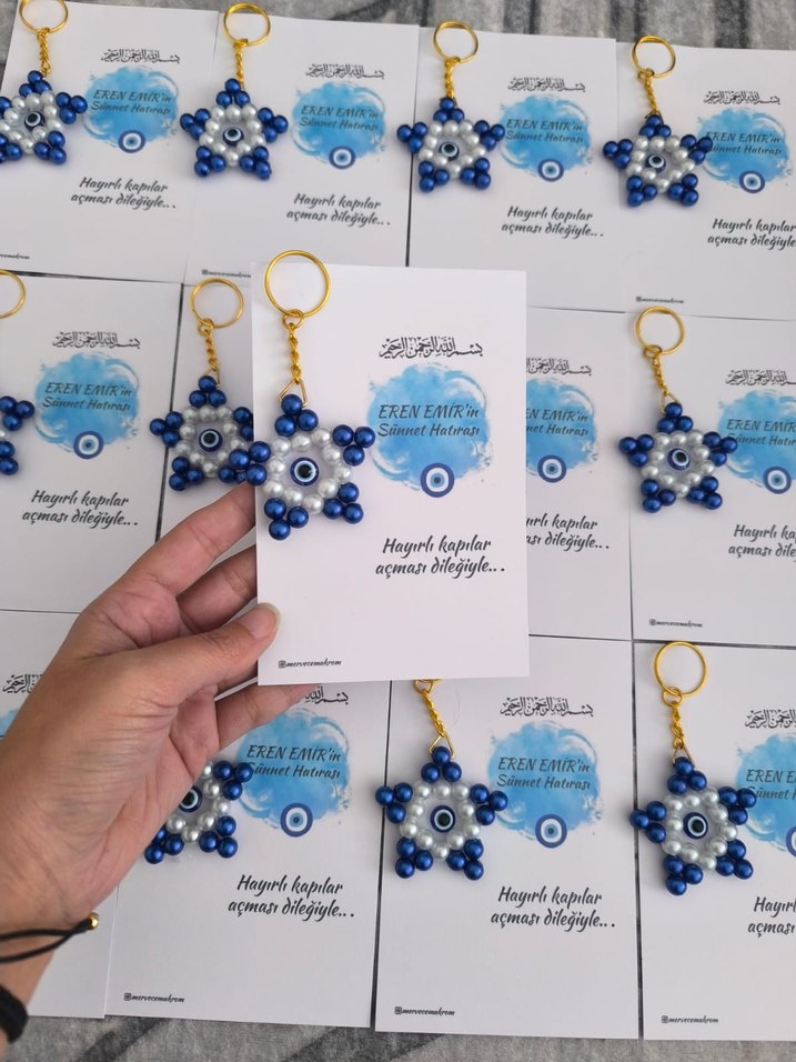 Mavi boncuklardan oluşan, bohem ve minimalist stile sahip hafif anahtarlık. Küçük nazar boncuğu ve iyi dilek kartı içerir.