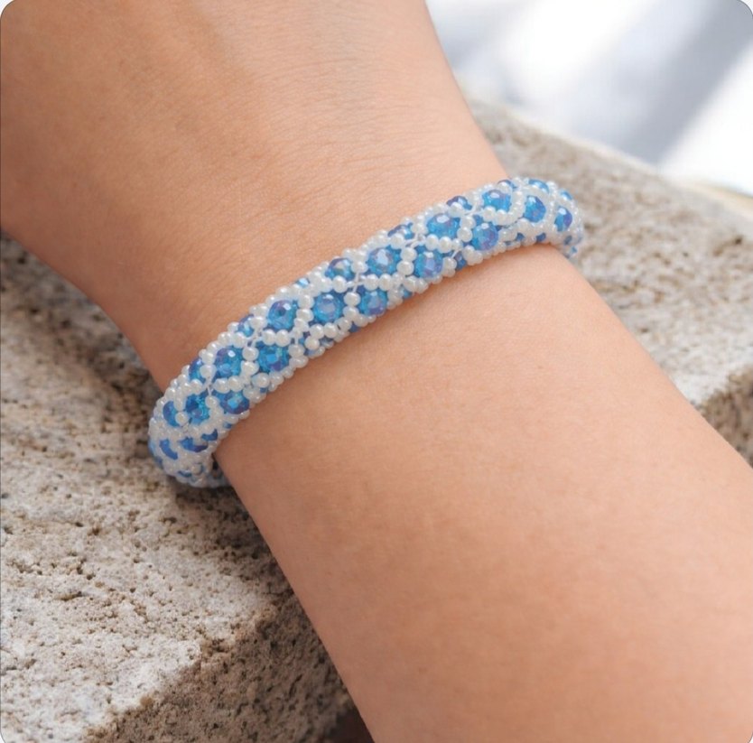 Pastel mavi boncuklarla örülmüş, bohem tarzda rahat bileklik, günlük kullanıma uygundur. 18 cm uzunluğunda dır.