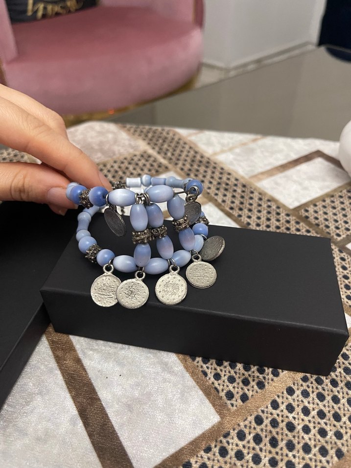 Mavi boncuklar ve gümüş renkli madeni para figürlü süslemelerle bohem tarzda kadın bileklik, günlük kullanıma uygun.