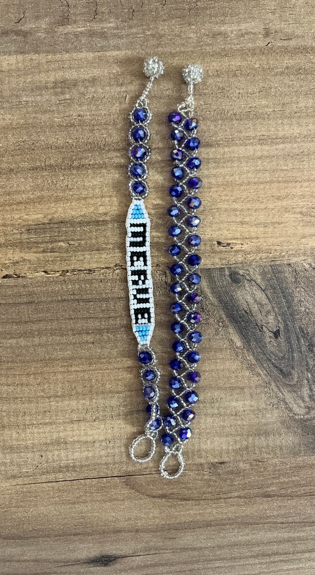 Parlak mavi boncuklar ve 'MERMAID' yazılı boncuk detayına sahip bohem, hippie tarzında kadın bileklik.