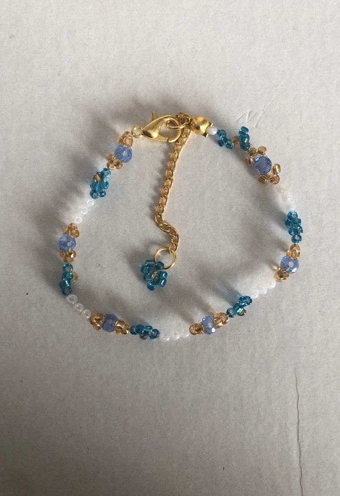 Mavi boncuklar ve altın detaylarla sade, bohem tarzda kadın bileklik.