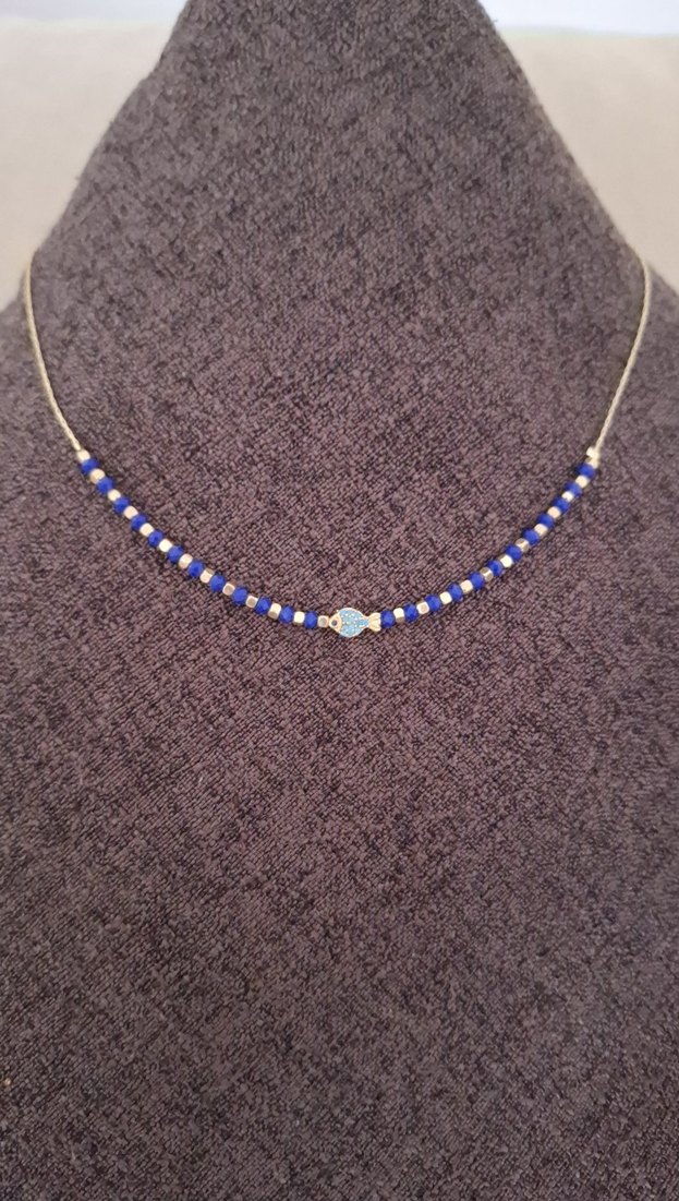 Mavi ve beyaz boncuklar ile küçük bir merkezi figür içerir,(mini balık)minimalist bohem tarzını yansıtır. Günlük kullanım için uygundur.