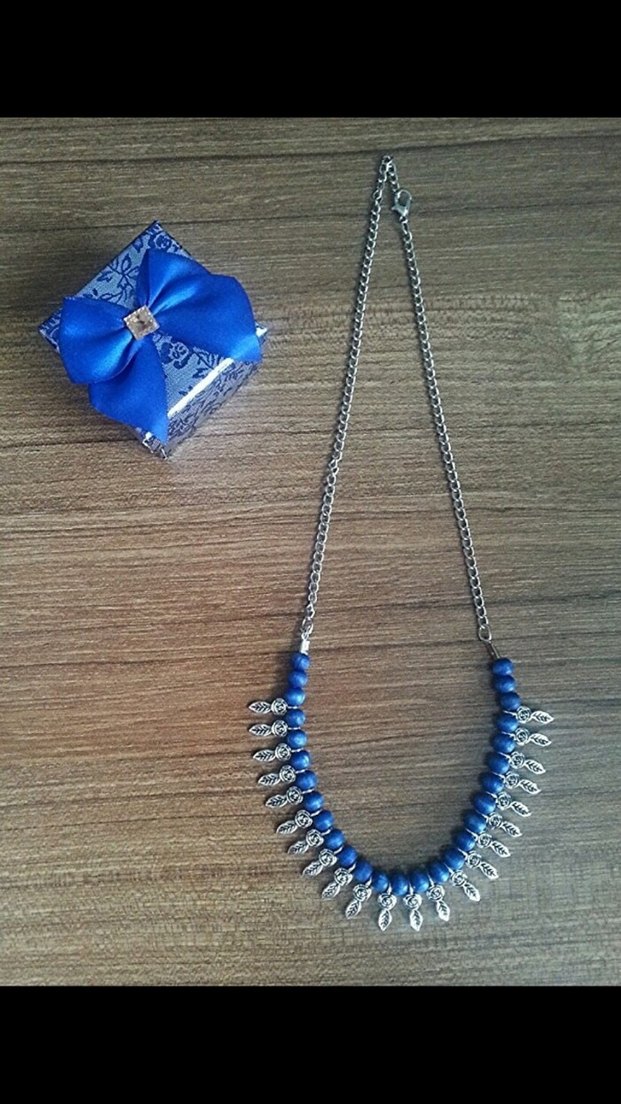 Parlak mavi boncuklar ve gümüş yaprak figürlü kolye, minimal ve bohem tarzlara uygun, günlük kullanıma uygun.