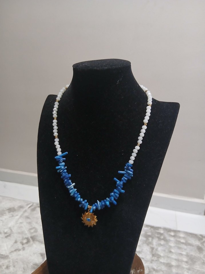 Koyu mavi ve beyaz boncuklarla kısa boyda, güneş şeklinde kolye ucu olan bohem tarzda bir kolye.