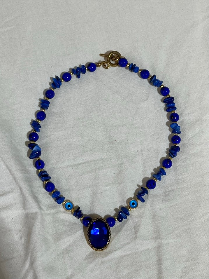 Bohem tarzda, mavi boncuklar ve işleme desenlerle süslenmiş midi uzunlukta kolye. Günlük kullanıma uygundur.