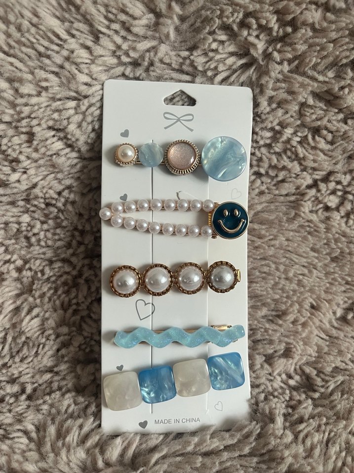 Pastel mavi tonlarında, boncuk detaylı, bohem tarzda, örgü malzemeden yapılmış vintage esintili saç tokaları seti.