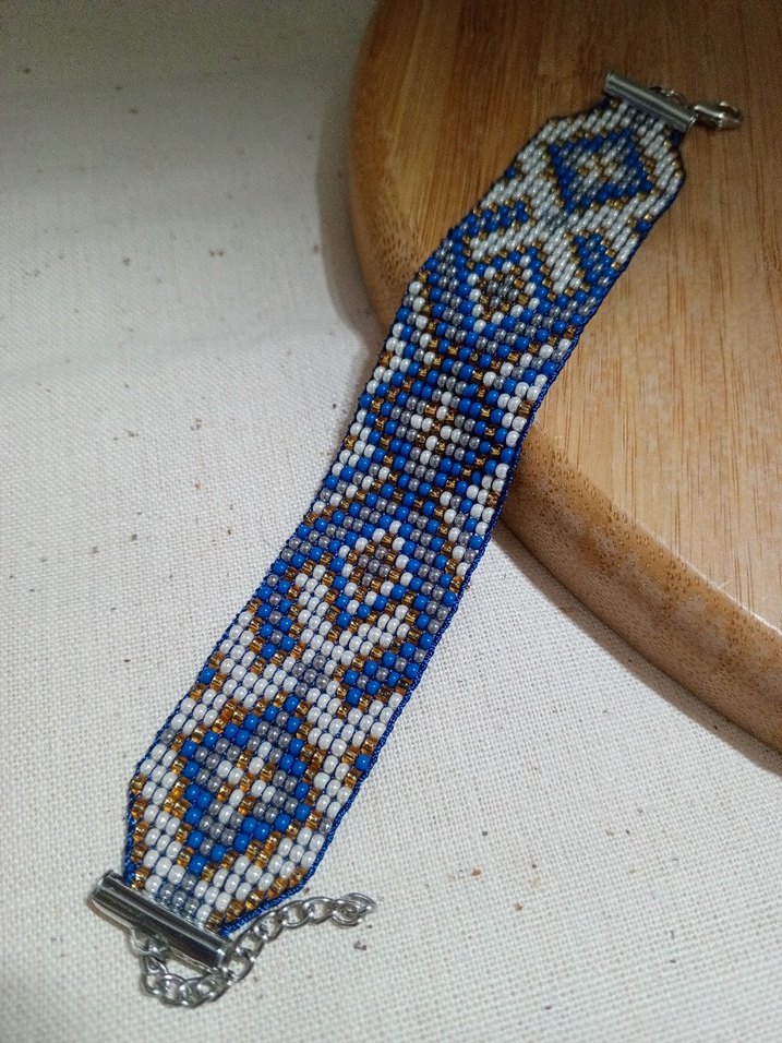 Mavi etnik desenli boncuklu bohem tarzı bileklik, açık hava etkinlikleri için uygundur. Ayarlanabilir toka ile rahat kullanım sağlar.