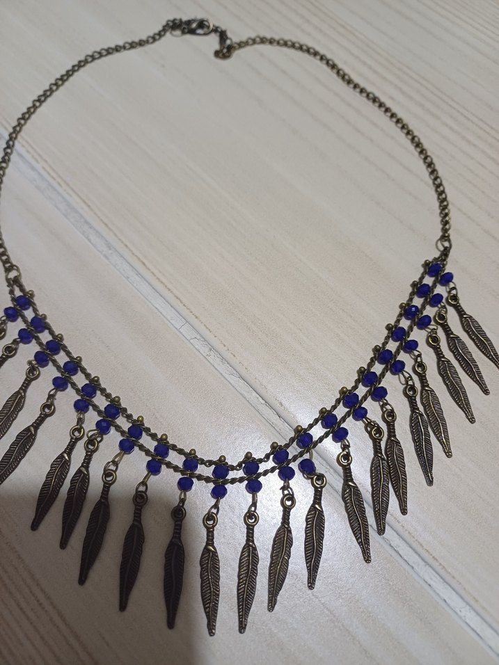 Bohem tarzda, mavi boncuklar ve tüy şeklinde detaylı zincirli midi uzunlukta etnik kolye.