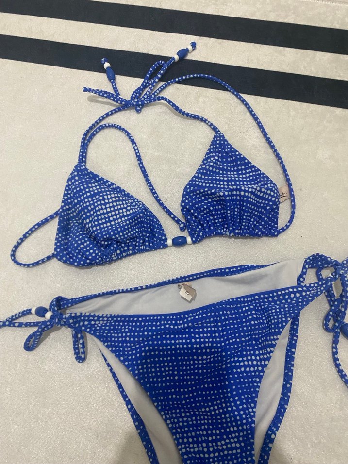 İpli üstü ve boncuk detaylı, mavi renkli, mini boy ve parlak görünümlü, vücuda oturan bikini. Cesur ve sokak modası tarzında, plaj için ideal. ️