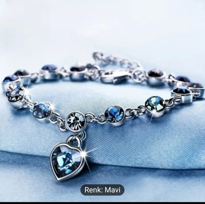 Mavi taşlar ve kalp şeklinde bir charm içeren boncuklu kadın bileklik, bohem stil ile klasik zarafeti romantik anlara taşır. kargo aliciya aittir.