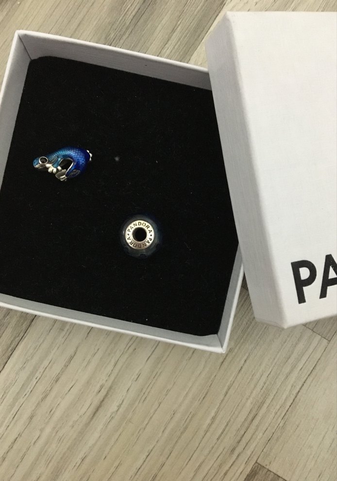 Mavi boncuklu ve baskılı desene sahip kadın charm, kutusunda "PA" yazısı ile. Bohem ve şık tarzlar için uygun, romantik akşamlar için ideal. Tanesi 300