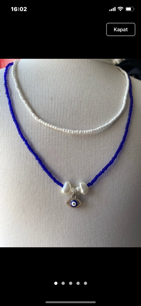 mavi ve beyaz boncuklardan oluşan, işlemeli nazar boncuğu detaylı kadın kolyesi. Günlük kullanıma uygun. el emeği