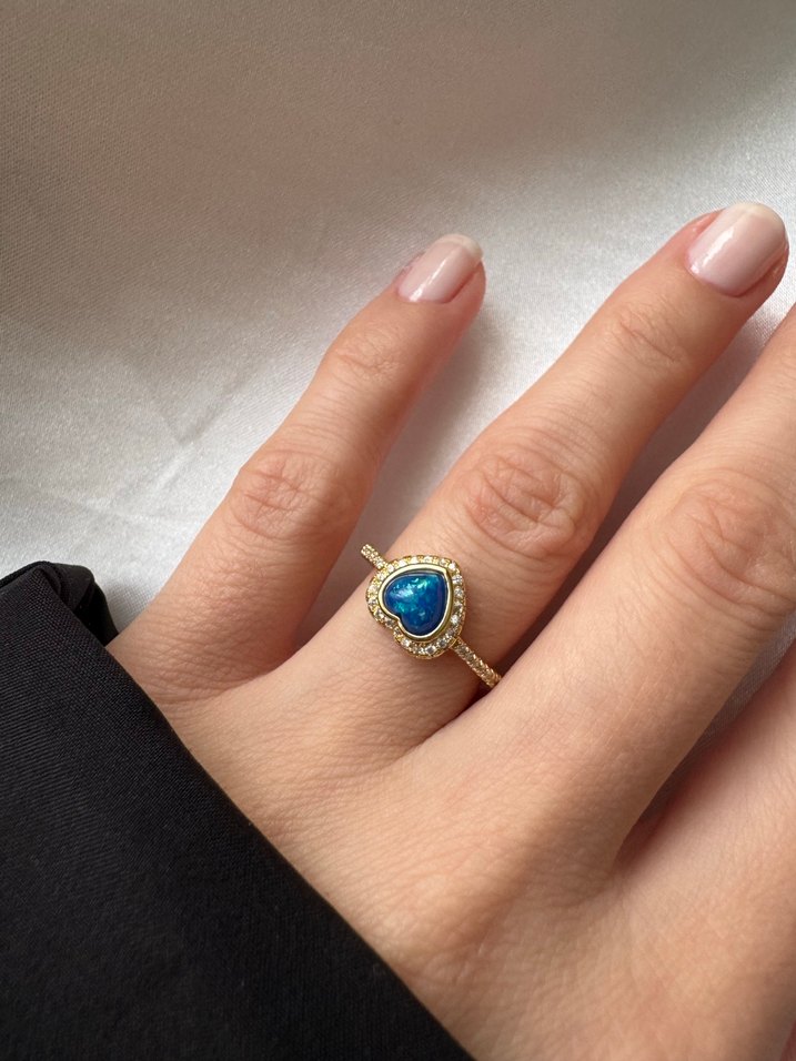 Bohem tarzda, koyu mavi kalp şeklinde taş ve boncuklarla süslenmiş altın renkli yüzük, romantik akşamlar için uygun.