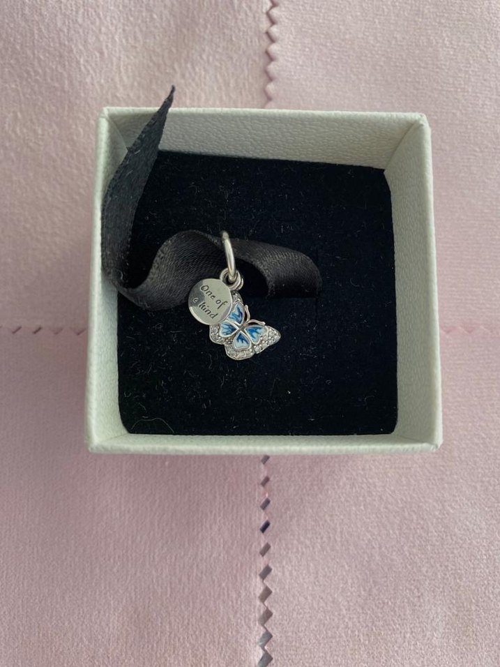 Pastel mavi boncuklu kelebek figürlü kadın charm, küçük kalp yazılı detaylı, minimalist ve bohem tarzlara uygun.