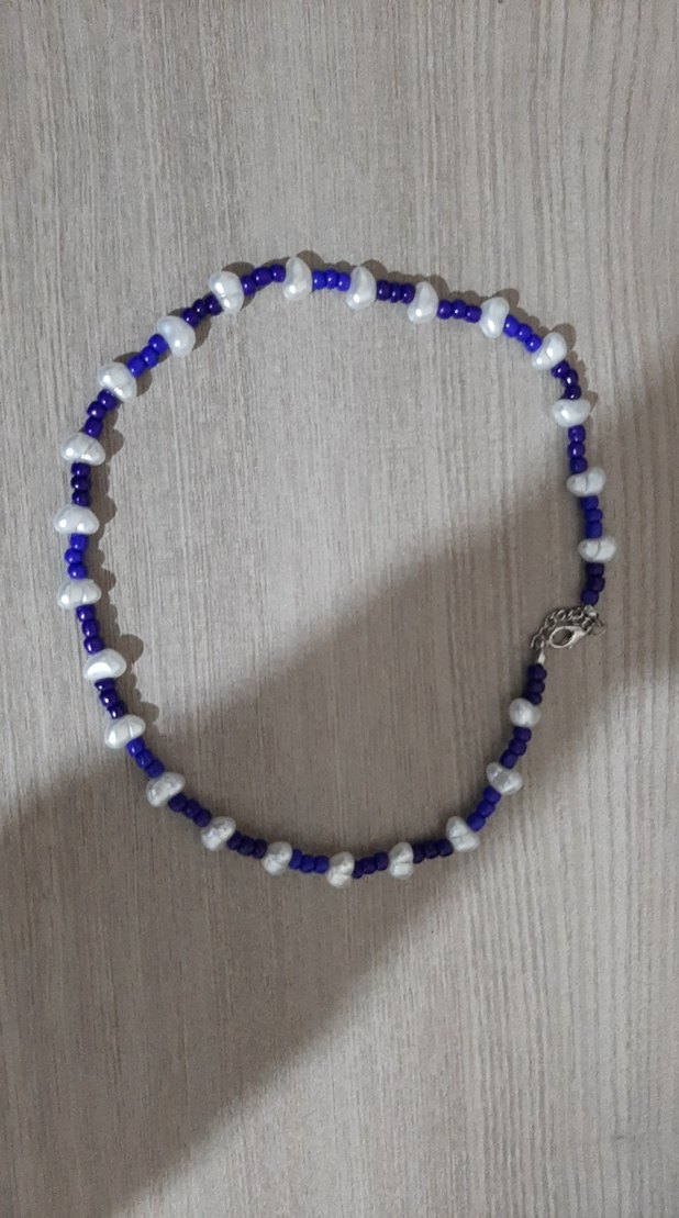 Bohem tarzda, koyu mavi ve beyaz boncuklardan oluşan midi uzunlukta, gündelik kullanıma uygun sade ve desen içermeyen kadın kolyesi.