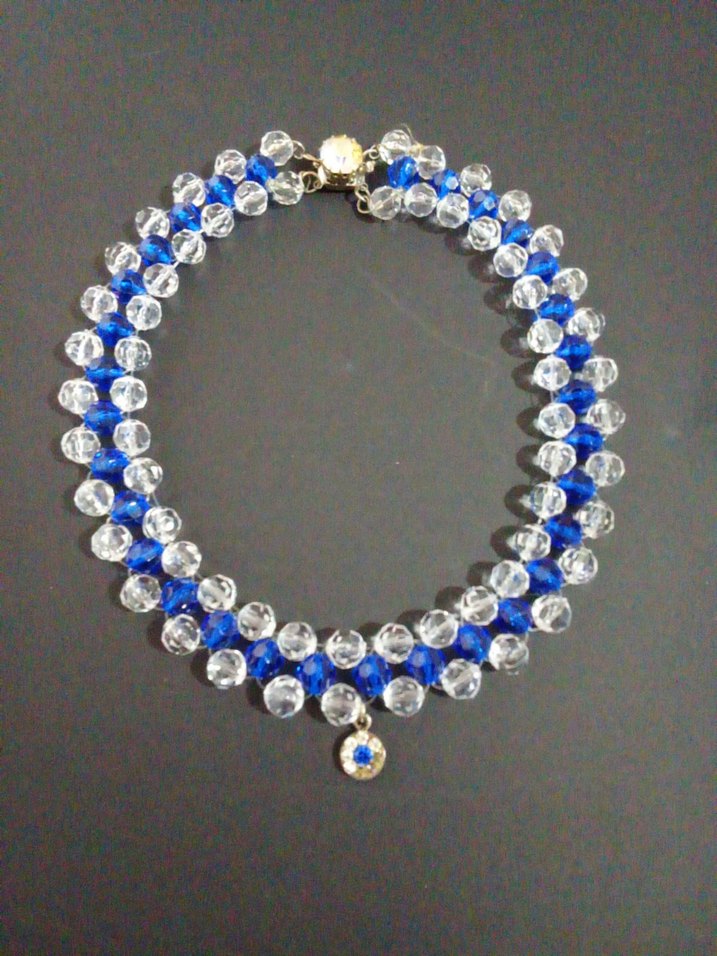 Mavi ve şeffaf boncuklardan oluşan, işleme desenli, klasik zarafet stilinde, düğünlere uygun midi uzunlukta kadın kolye.
