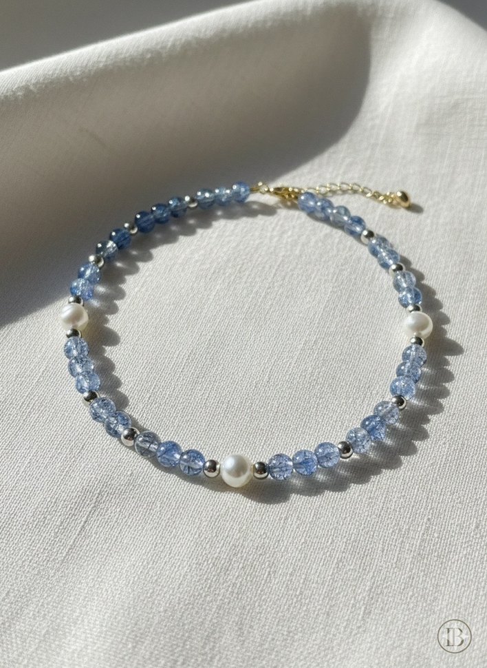 Bu açık mavi boncuklu kolye, inci detaylarıyla minimalist bohem tarzını yansıtır, günlük kullanıma uygundur. Normal midi uzunluktadır ve hafif tie-dye deseni vardır.