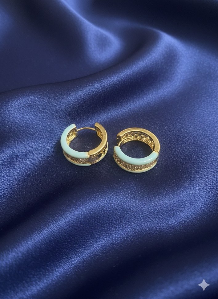 Pastel mavi boncuk detaylı altın renk mini halka küpeler, romantik akşamlar için modern klasik tarzda.