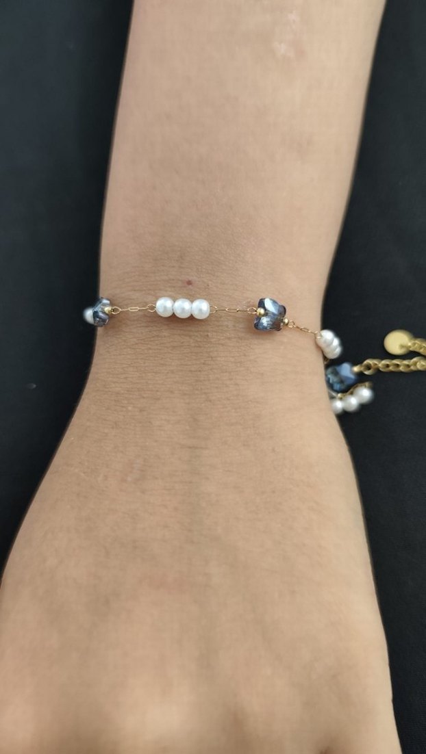 Hafif mavi ve beyaz boncukların yer aldığı minimalist kadın bileklik, günlük rahat kullanıma uygun bohem tarzda tasarlanmıştır.