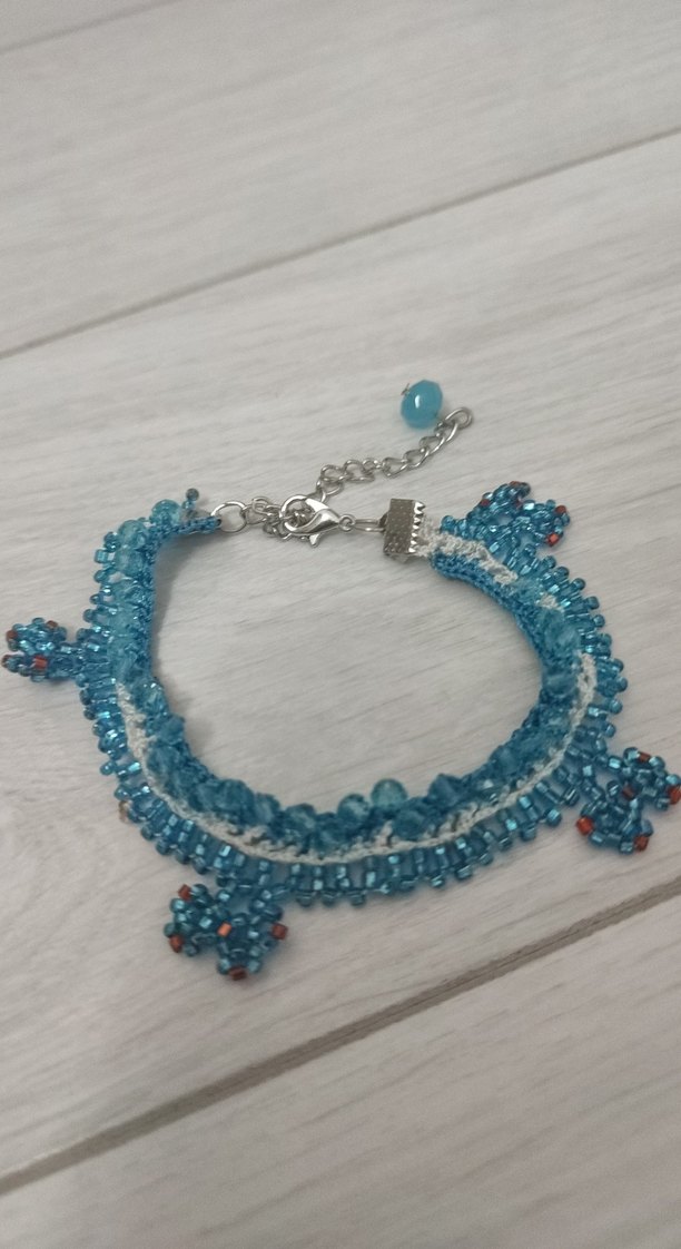 Turkuaz boncuklar ve nakışlı desenlerle süslenmiş bohem tarzda bileklik. Canlı renkli ve günlük kullanıma uygun, güvenli tokalı.