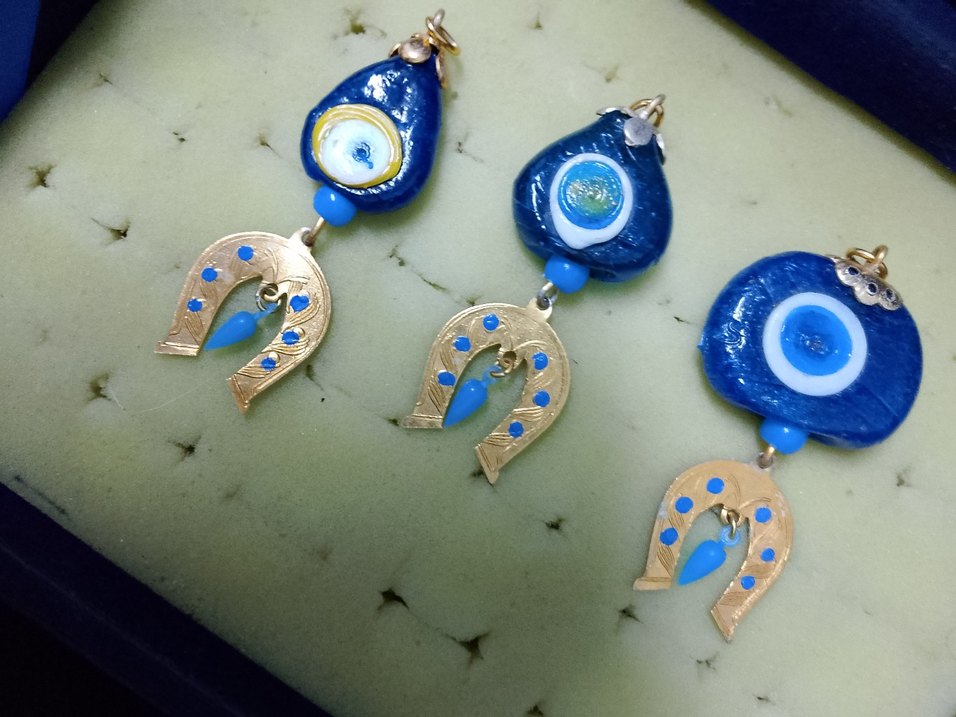 Nakışlı detaylara ve renkli boncuklara sahip mavi charm, nal figürü içerir. Günlük kullanıma uygun bohem tarzda.