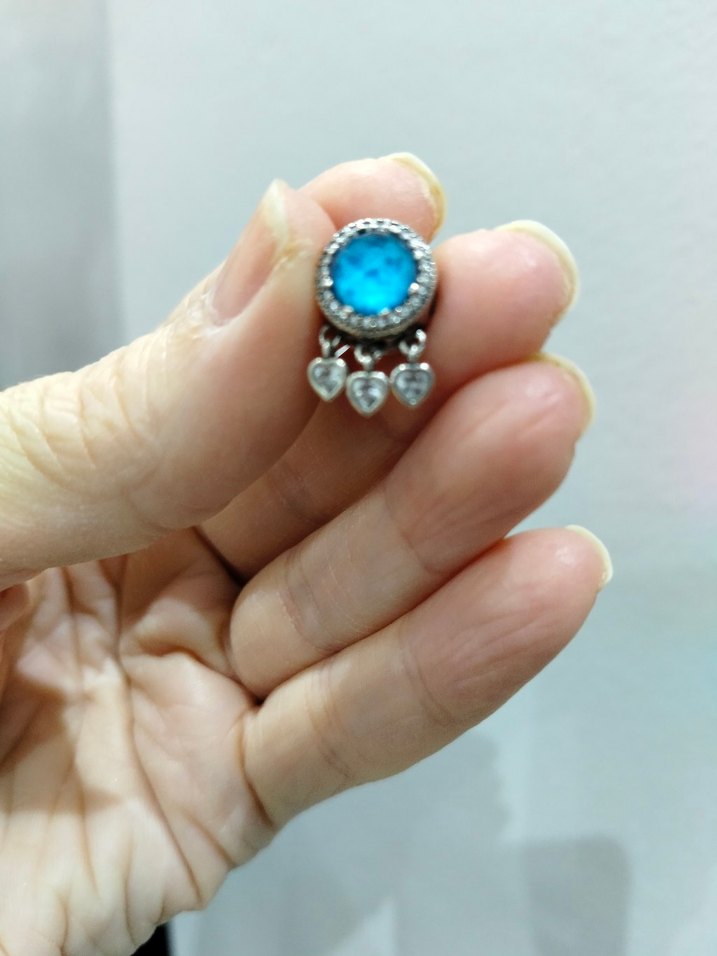 mavi boncuk ve ucunda küçük sallantılı kalpler bulunan düş kapanı figürlü charm. 925 ayar gümüştür.