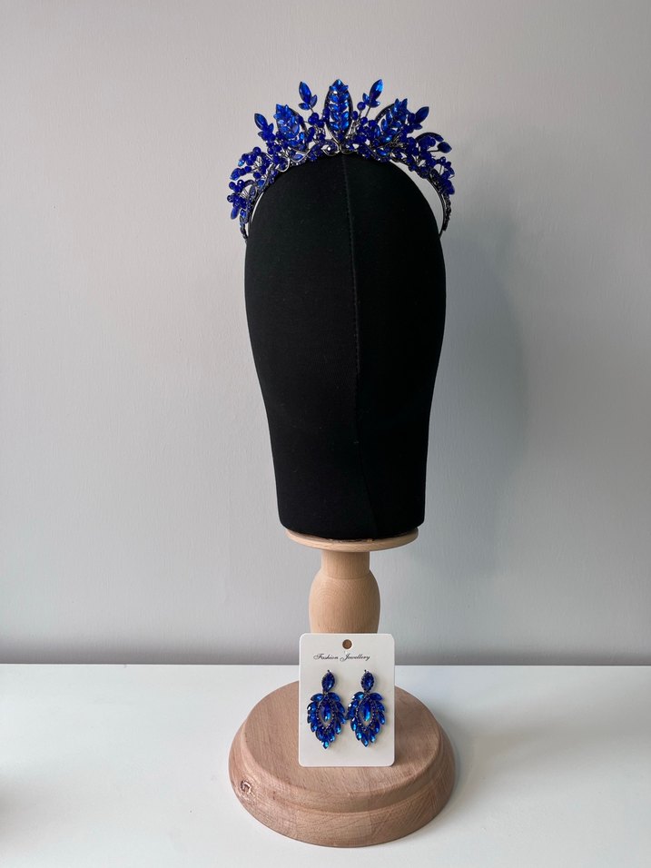 Koyu mavi boncuklu seramik taç ve uyumlu küpe seti, gotik ve avangart tarzıyla dikkat çeker.