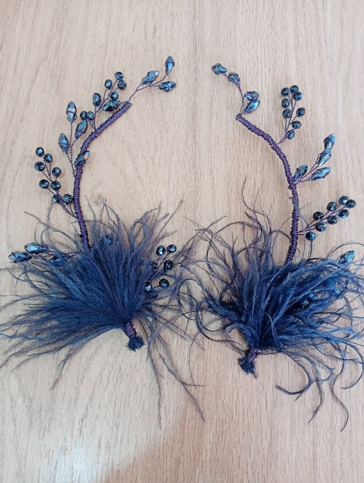 Koyu mavi renkli, boncuk ve tüy detaylı, avant-garde bohem tarzda kadın saç aksesuarı. Moda öncülerine uygun.