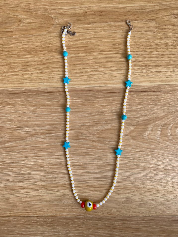 Uzun, boncuklu ve mavi-beyaz renklerde yıldız figürlü detaylara sahip bohem tarzda kadın kolye.