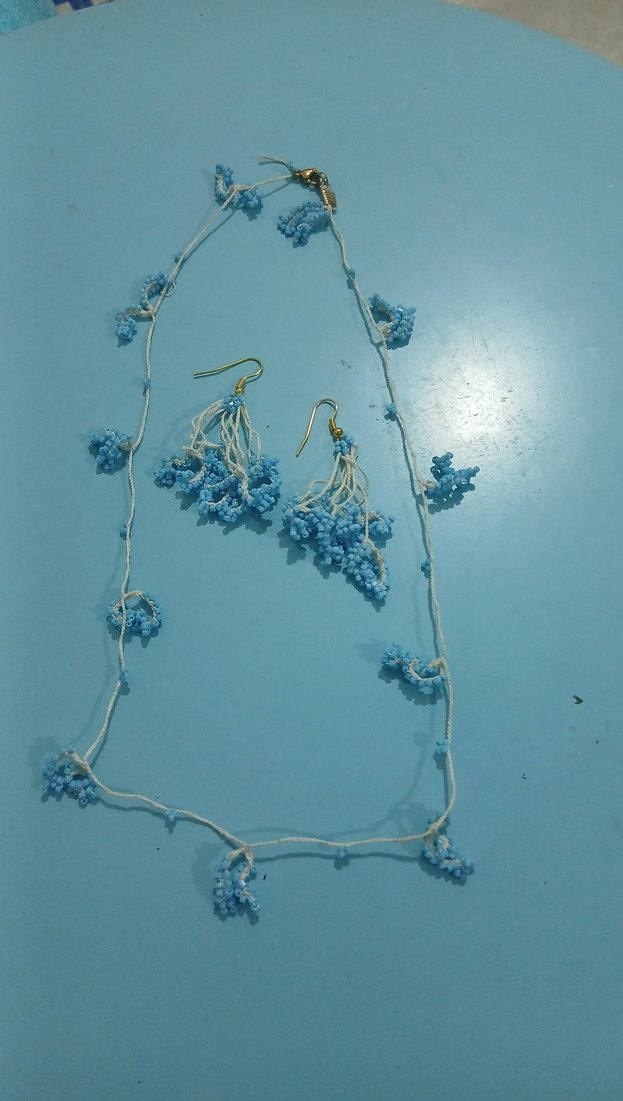 Uzun boylu, mavi pastel tonlarında boncuklu ve nakışlı detaylara sahip bohem tarzda kolye ve küpe seti, düğünler için uygun.