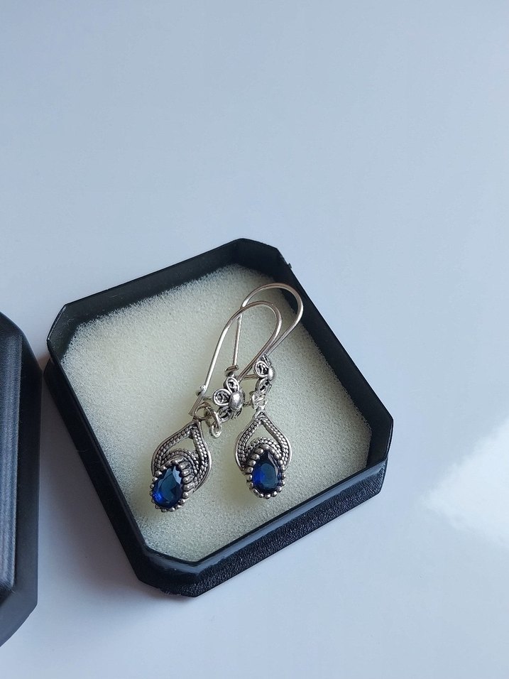 Mavi boncuk detaylı, işleme desenli kısa uzunlukta vintage ve bohem tarzı küpeler, düğün için uygundur. Sadece 3 kez taktığım bu telkari küpeler çok şık kombinleniyor.