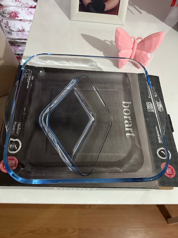 Mavi renkli Borar cam fırın kabı, dayanıklı ve şeffaf yapısıyla pişirme işlemlerinde kullanılır.