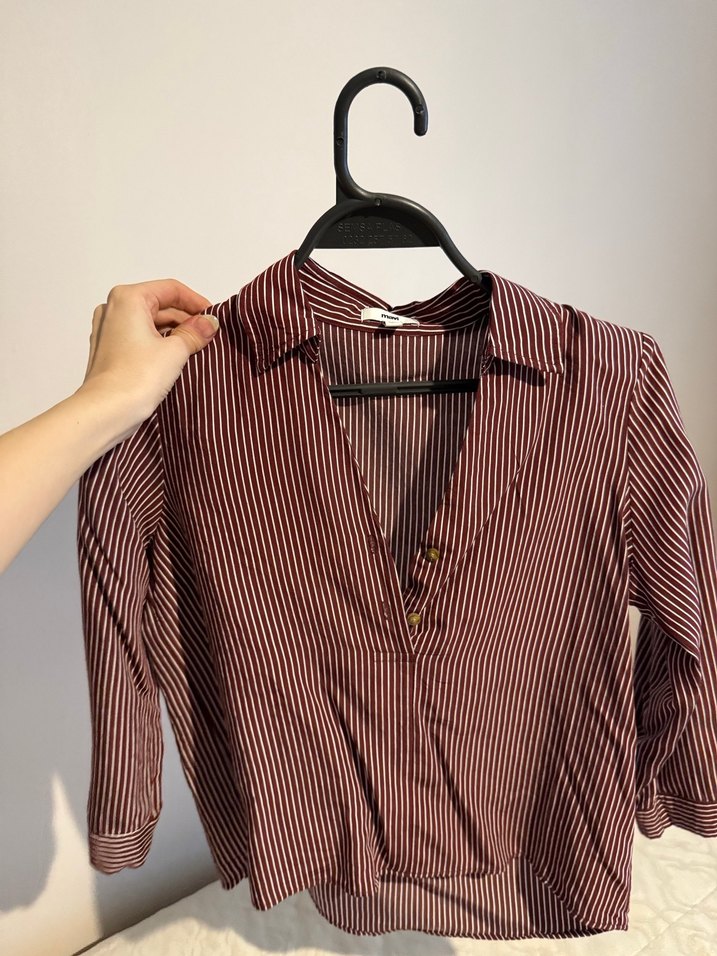 Bordo çizgili, düğmeli ve uzun kollu, midi boy kadın gömleği. Yeni ve çok az kullanıldı.