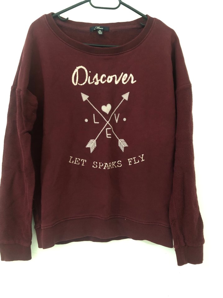 Bordo renkli pamuklu oversize sweatshirt, uzun kollu ve bisiklet yaka tasarıma sahiptir. Üzerinde oklar ve "Discover Love Let Sparks Fly" yazılı baskı bulunur, fermuarlı detay içerir. ❤️ kollarında hafif tüylenmeler mevcut