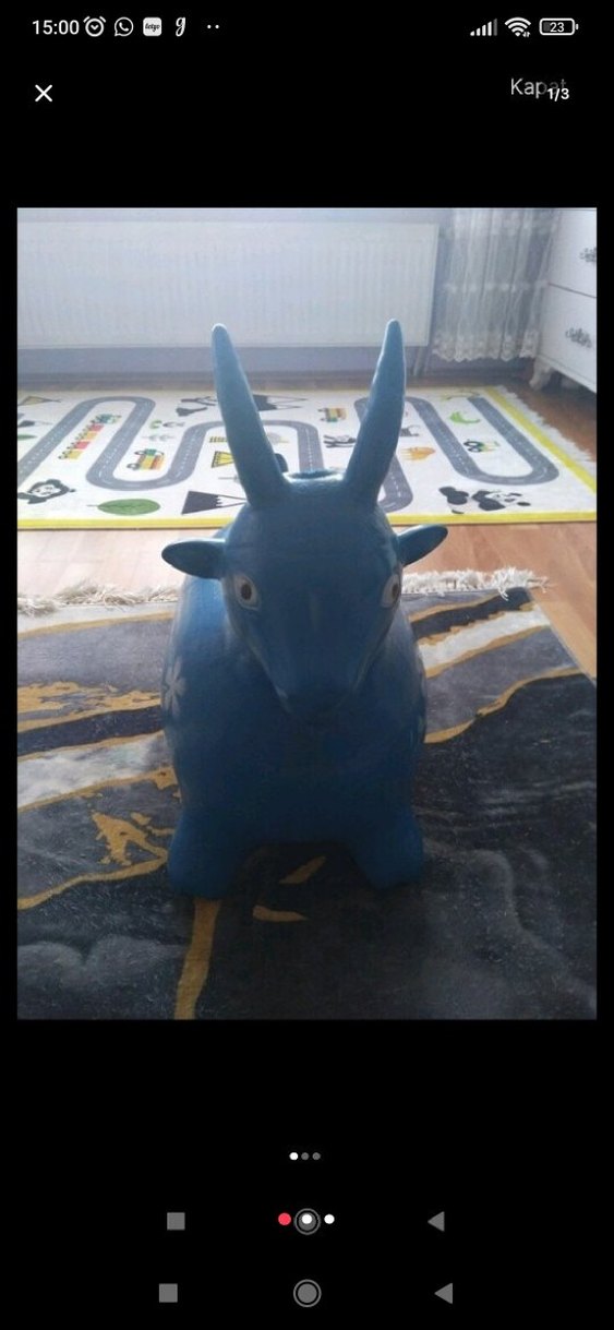Koyu mavi renkte boynuzlu oyuncak hayvan, oyun ve iç mekan kullanımı için uygundur. Pürüzsüz yüzeyli ve sağlam yapılıdır.
