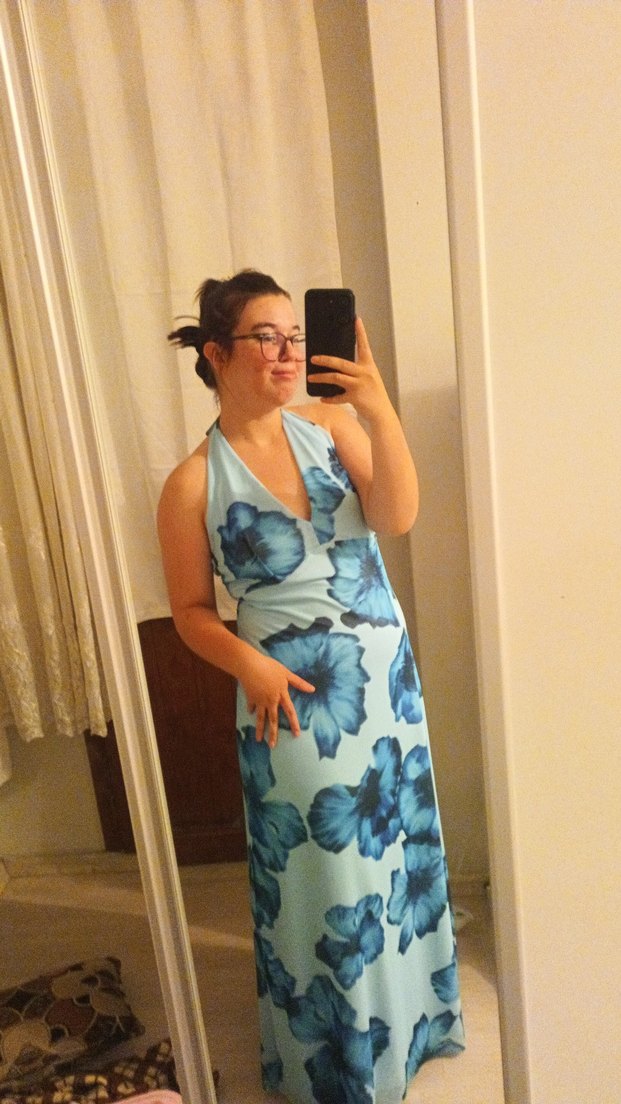 mavi boyundan bağlamalı elbise sırtı açık.