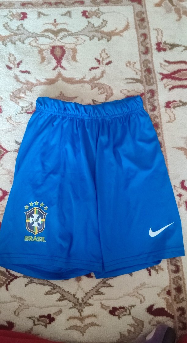 Bol kesim mavi spor şort. Brazil arması ve Nike logosu bulunur. Sentetik kumaştan, athleisure ve streetwear için uygundur. ♂️