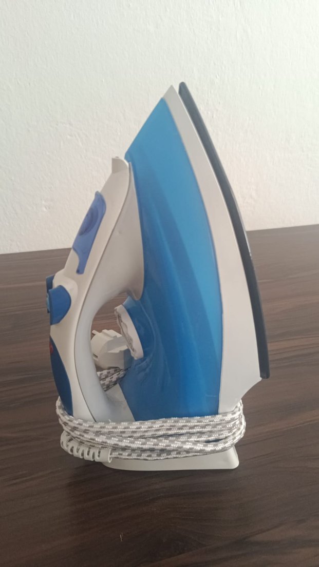 Ergonomik saplı, kablo saklama özellikli açık mavi buharlı ütü. Pürüzsüz ve etkili ütüleme sağlar.