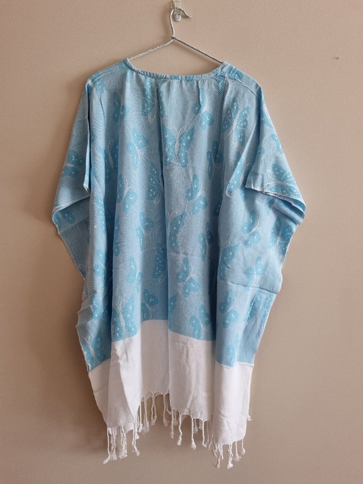Mavi pamuklu kadın plaj giyim,kelebek desenli bol kesim ve drapeli stilde. Kısa kollu, yuvarlak yakalı ve püsküllü detaylı bohem tarzda.