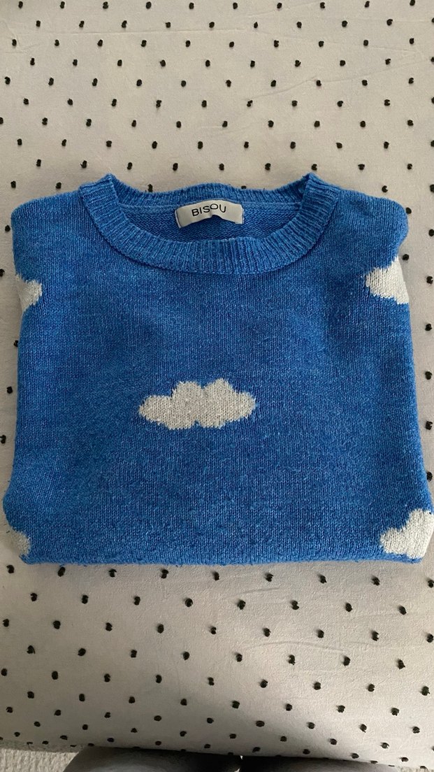 Bisou markalı, mavi renkli bulut desenli triko kazak. Yuvarlak yaka, uzun kollu ve rahat kesime sahip, günlük kullanım için idealdir. ☁️