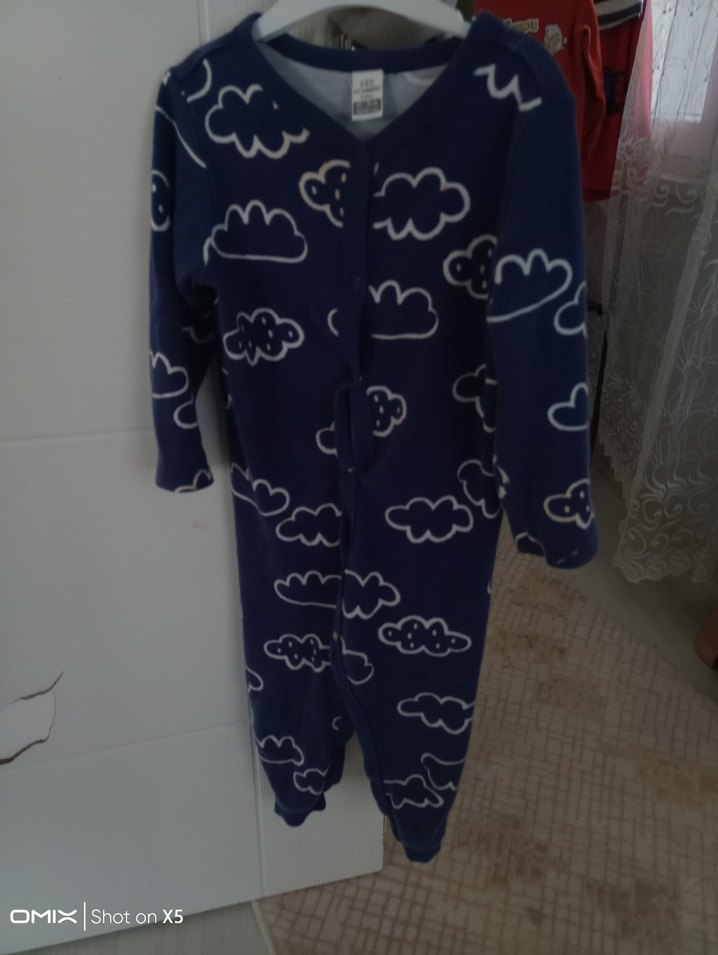 Uzun kollu, yuvarlak yaka ve bulut desenli koyu mavi renkli erkek bebek tulumu. Yumuşak ve sıcak dokuda örme kumaştan üretilmiştir. ️